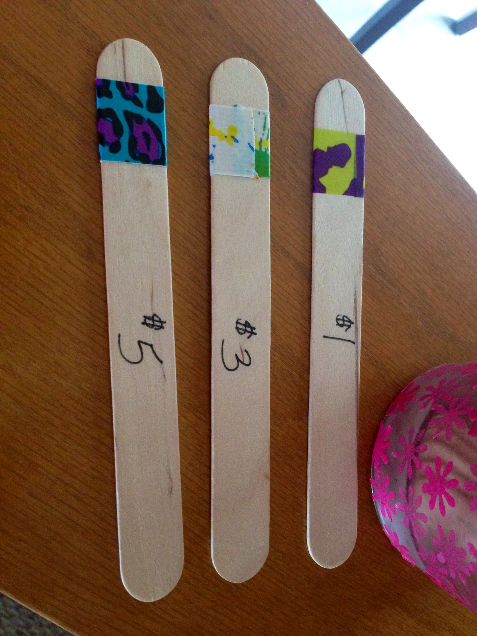 Some of the chores were simple, like clearing the table.  Others were more complicated or time-consuming, like vacuuming the stairs or sweeping the garage and driveway.  Each chore was priced at either $1, $3, or $5; I wrote the price on the back of each stick.  Once they completed a chore, they were allowed to flip the stick over and see how much money they earned.  You can easily add new chores by purchasing more sticks and “swap” sticks by changing the tape.  If the middle boy outgrows a chore, all I have to do is change the tape and it becomes a chore for the youngest.