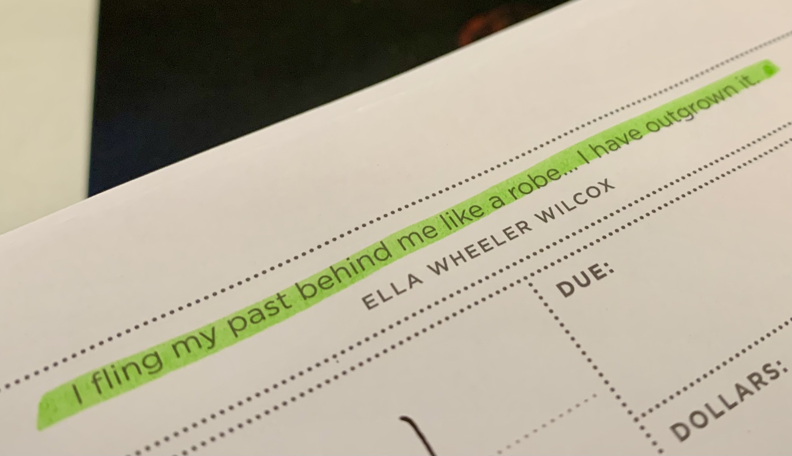 Close up of a planner page with the quotation "I fling my past behind me like a robe...I have outgrown it." by Ella Wheeler Wilcox