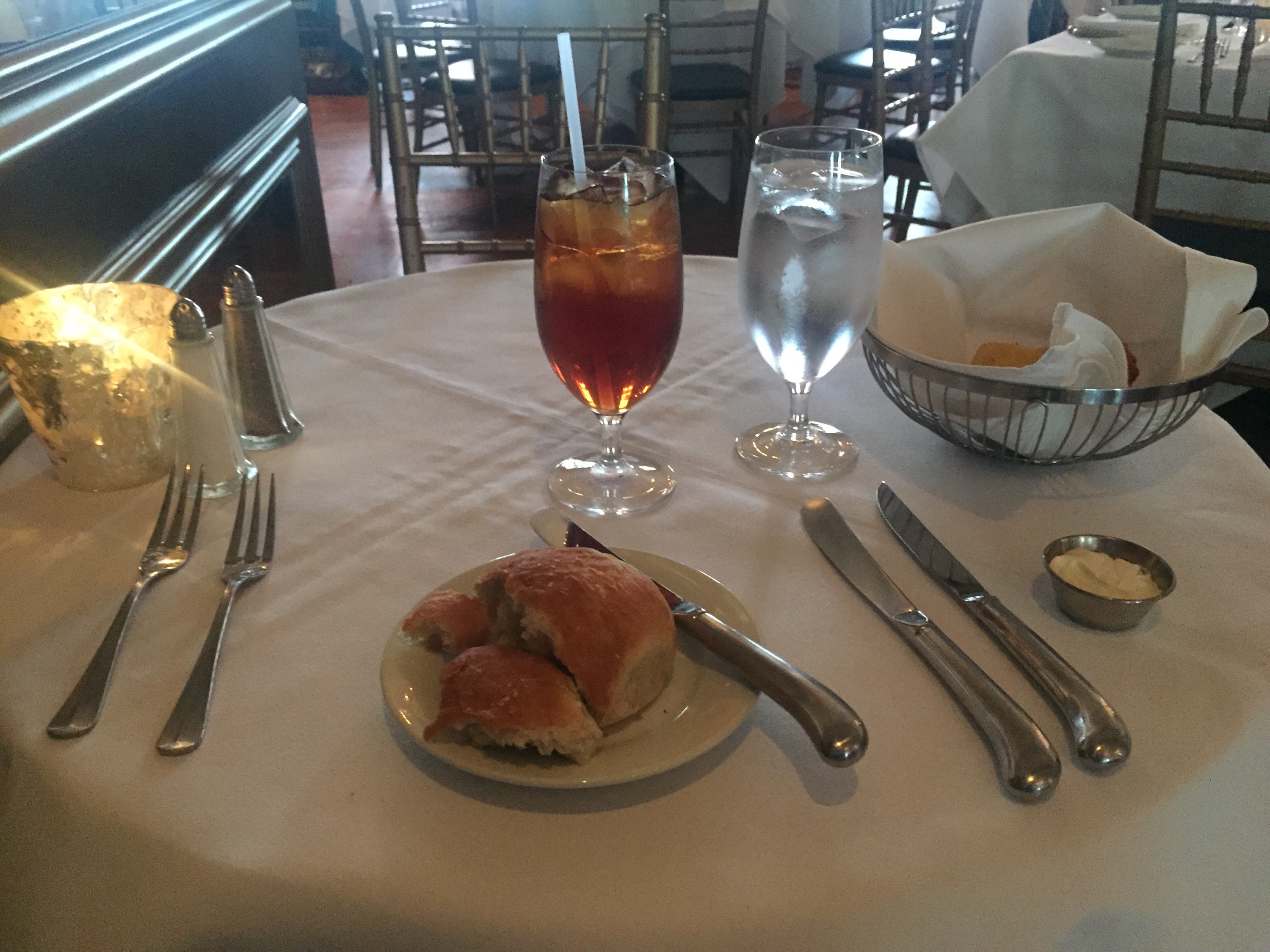 My final stop was dinner at The Olde Pink House. The waitress (Megan) asked if she could excuse herself to “fetch some bread for my table”–how fancy is that?!? She came back and asked me how hungry I was, then recommended an appetizer and two different entrees. Homegurl ran through all the ingredients too–she is good at her job for real.